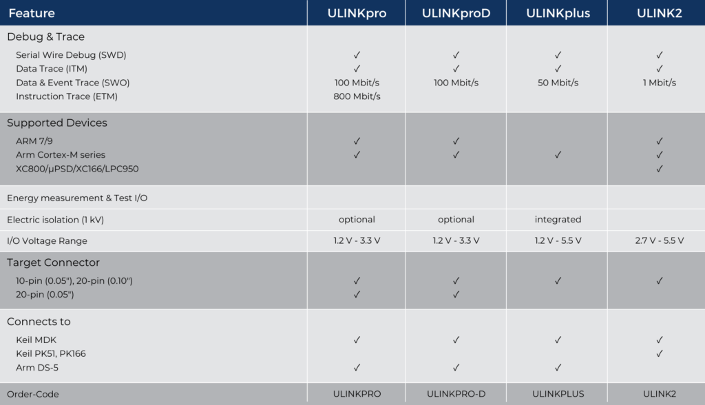 A família ULINK oferece suporte a recursos tradicionais, como pontos de interrupção simples e complexos, janelas de inspeção e controle de execução. Utilizando a saída serial SWO (Serial Wire Output), recursos adicionais de rastreamento, como o analisador de sistema, são suportados.